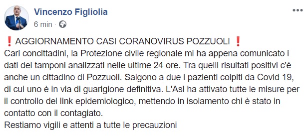 Ore 16:45. Pozzuoli. AGG. CORONAVIRUS. Sindaco Figliolia: "Salgono a due i pazienti colpiti da COVID-19"