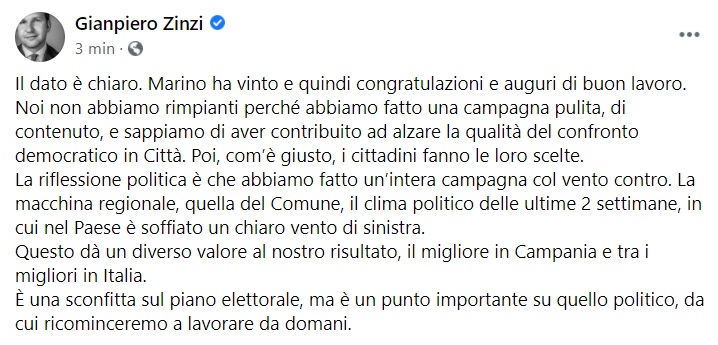 Questo quanto pubblicato sulla sua pagina fb: "Il dato è chiaro. Marino ha vinto e quindi congratulazioni e auguri di buon lavoro. Noi non abbiamo rimpianti perché abbiamo fatto una campagna pulita, di contenuto, e sappiamo di aver contribuito ad alzare la qualità del confronto democratico in Città. Poi, com’è giusto, i cittadini fanno le loro scelte. La riflessione politica è che abbiamo fatto un’intera campagna col vento contro. La macchina regionale, quella del Comune, il clima politico delle ultime 2 settimane, in cui nel Paese è soffiato un chiaro vento di sinistra. Questo dà un diverso valore al nostro risultato, il migliore in Campania e tra i migliori in Italia. È una sconfitta sul piano elettorale, ma è un punto importante su quello politico, da cui ricominceremo a lavorare da domani."
