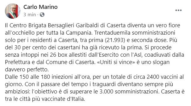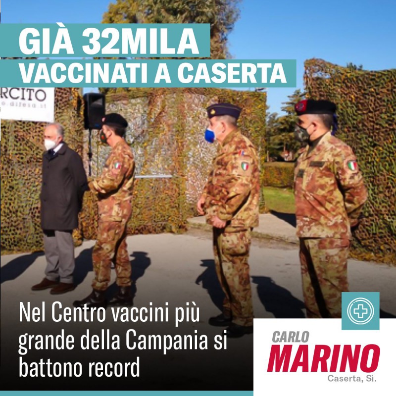 "Il Centro Brigata Bersaglieri Garibaldi di Caserta diventa un vero fiore all’occhiello per tutta la Campania. Trentaduemila somministrazioni solo per i residenti a Caserta, tra prima (21.993) e seconda dose. Più del 30 per cento dei casertani ha già ricevuto la prima. -Si legge nella nota- Si procede senza intoppi nei 26 box allestiti dall’Esercito con l'Asl, coadiuvati dalla Prefettura e dal Comune di Caserta. -Si legge nella nota- «Uniti si vince» è uno slogan davvero perfetto. Dalle 150 alle 180 iniezioni all'ora, per un totale di circa 2400 vaccini al giorno. Con il passare del tempo i traguardi diventano sempre più ambiziosi: l’obiettivo è di superare le 3.000 somministrazioni. Caserta è tra le città più vaccinate d’Italia."