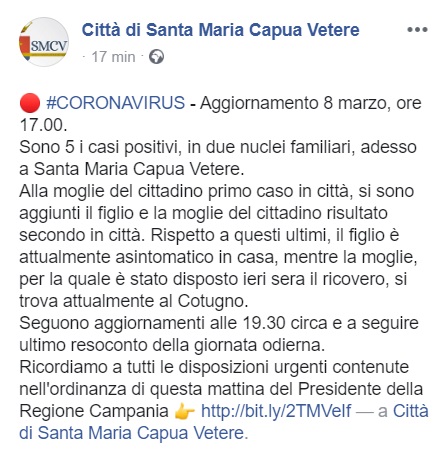 Questo quanto apprendiamo dalla pagina FB del Comune di SMCV