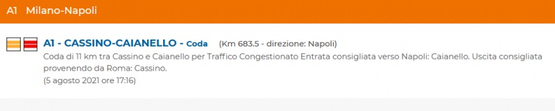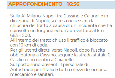 Per gli utenti diretti verso Napoli, dopo l'uscita obbligatoria a Cassino, seguire la strada statale 6 Casilina con rientro a Caianello. Sul posto sono presenti il personale di Autostrade per l'Italia e tutti i mezzi di soccorso meccanico e sanitari".