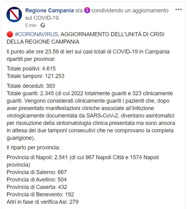 Questo quanto pubblicato dalla Regione Campania