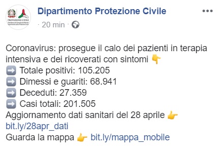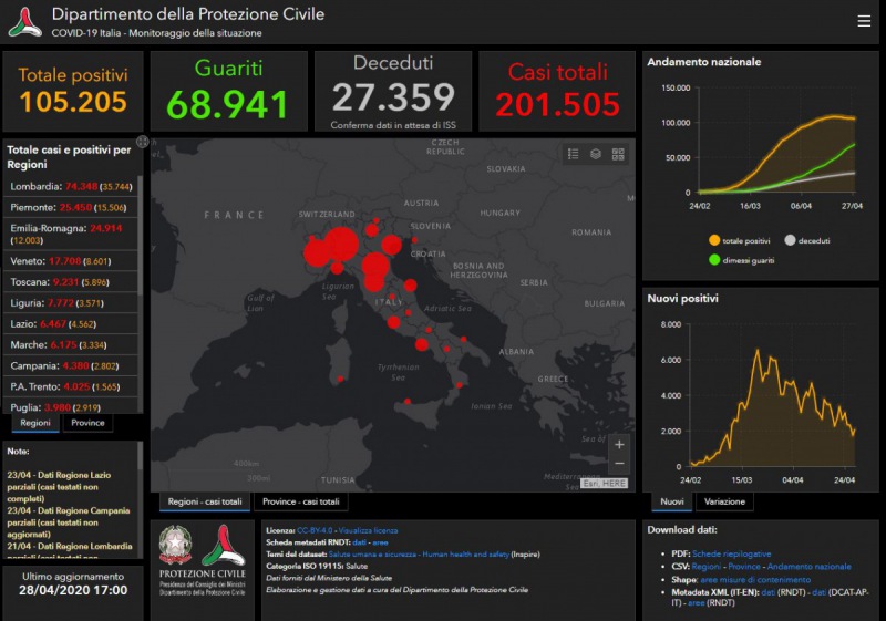 Ore 18:20. AGG. CORONAVIRUS in Italia: 105.205 positivi, 27.359 deceduti, 68.941 guariti