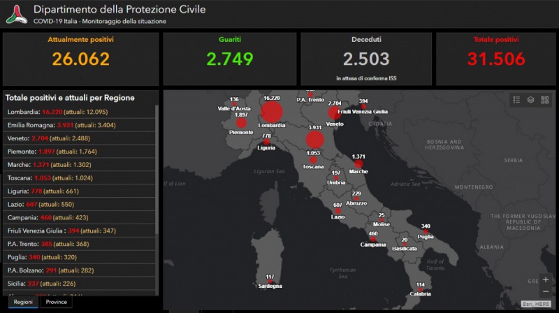 Questi i dati comunicati sul contagio del Coronavirus a livello nazionale dalla Prot. Civile. Si tratta di 26.062 positivi, di questi 2.749 guariti e 2.503 deceduti.