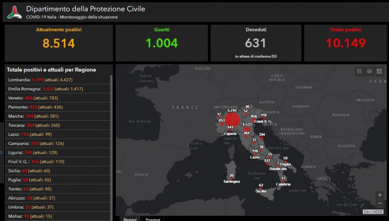 Questo l'ultimo aggiornamento pubblicato dalla Protezione Civile in merito al Coronavirus. 8.514 sono gli attuali positivi, per un totale di 10.149 persone in Italia sin dall'inizio dell'emergenza. Di questi, 1.004 sono guariti e 631 quelli deceduti. In Campania sono 126 gli attuali positivi al Coronavirus.
