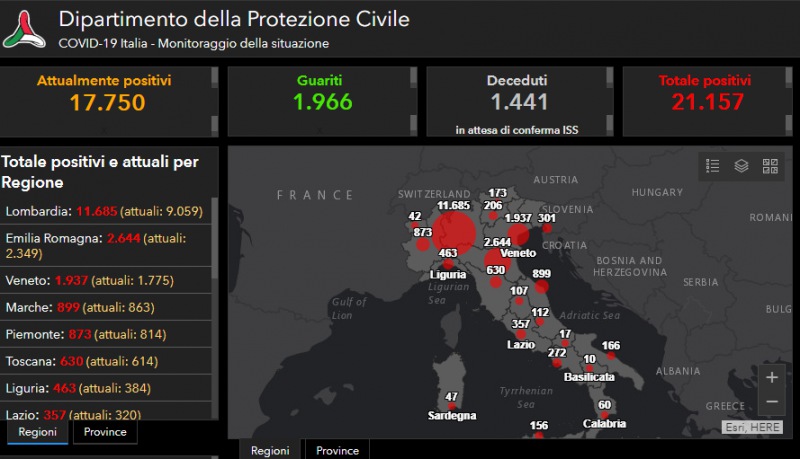 Secondo i dati della Protezione Civile sono 17750 i contagiati in Italia. In totale sono 17750 i positivi dei quali 1966 guariti e 1441 deceduti.
