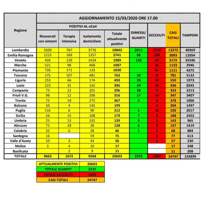 Secondo i dati del Ministero della Salute sono 20603 i contagiati in Italia. In totale sono 24747 i positivi dei quali 2335 guariti e 1809 deceduti.