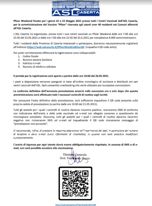 Ore 18. Rettifica Asl Ce. 22-23 maggio vaccino Pfizer a tutti gli over 40 che si iscriveranno