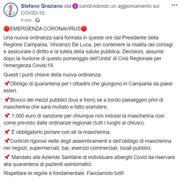 Questo quanto pubblicato sulla pagina facebook del Cons. Reg. e Pres. della Commissione Sanità della Regione Campania Graziano: