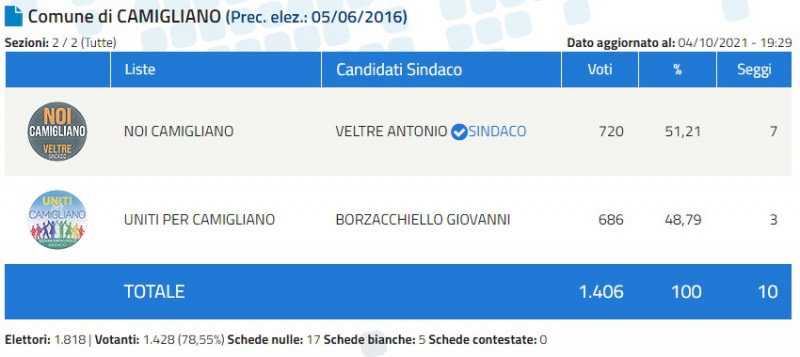 Concluso lo scrutinio a Camigliano, e Antonio Veltre è stato eletto Sindaco.