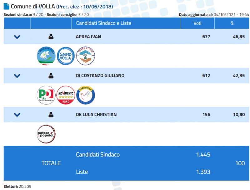 Volla. Iniziano a comparire i primi dati ministeriali in riferimento alle elezioni comunali. Ivan Aprea è attualmente in vantaggio con il 46,85%. A seguire, con poche preferenze di distacco, c'è Giuliano di Costanzo con il 42,35%, mentre Christian De Luca ricopre l'ultima piazza con il 10,80%.