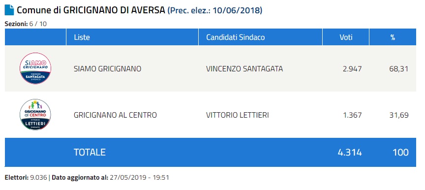 Ore 19:50. Elez. Gricignano d'Aversa. Dati Ministero. SANTAGATA ancora in vantaggio