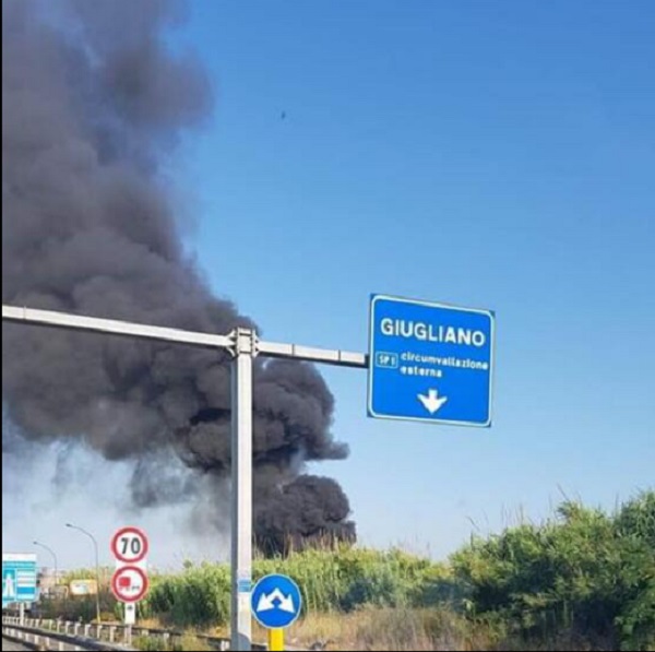 Sull'asse mediano dallo svincolo dell'uscita Giugliano/Circumv. esterna è chiaramente visibile questa nube nerissima di fumo.