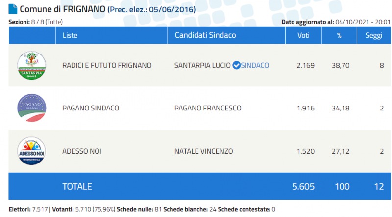 Concluso lo scrutinio a Frignano: è Lucio Santarpia, candidato Sindaco della lista 'Radici e Futuro Frignano' il primo cittadino. Santarpia ha avuto la meglio sugli avversari Francesco Pagano e Vincenzo Natale.