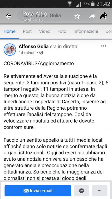 Questo quanto apprendiamo dalla pagina facebook del Sindaco Golia: