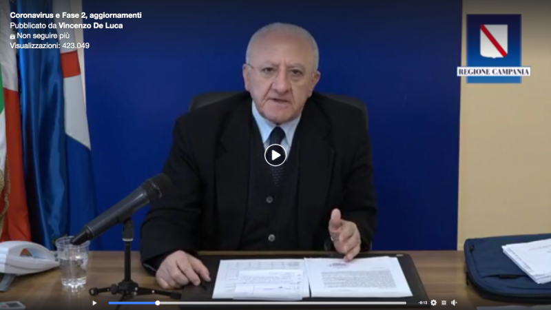 Questo il testo del post fb pubblicato dal Presidente della Regione Campania De Luca: "