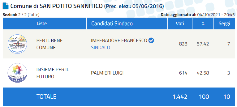 Francesco Imperadore è stato confermato Sindaco di San Potito Sannitico. Questi i risultati elettorali come riportati del sito web del Ministero.