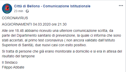 Alle ore 18.48 abbiamo ricevuto una ulteriore comunicazione scritta, da parte del Dipartimento sanitario di prevenzione, la quale ci informa che sono stati accertati, al primo test coronavirus (non ancora validato dall’Istituto Superiore di Sanità), due nuovi casi con esito positivo. Si tratta di persone che già erano monitorate a domicilio e si era in attesa del risultato del tampone