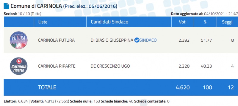 E' stato eletto il nuovo Sindaco di Carinola: è Giuseppina Di Biasio, candidata con la lista 'Carinola Futura'. La Di Biasio ha vinto contro il suo sfidante, Ugo De Crescenzo, candidato con la lista 'Carinola Riparte'.