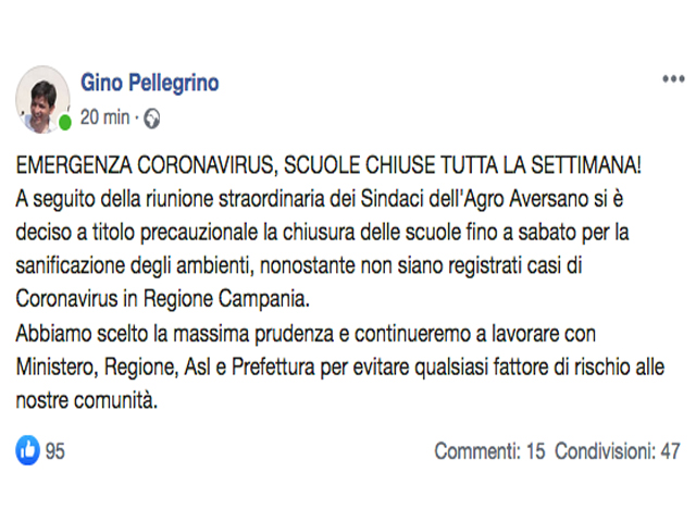Apoprendiamo dal profilo fb del Sindaco di Parete Gino Pellegrino: "EMERGENZA CORONAVIRUS, SCUOLE CHIUSE TUTTA LA SETTIMANA!