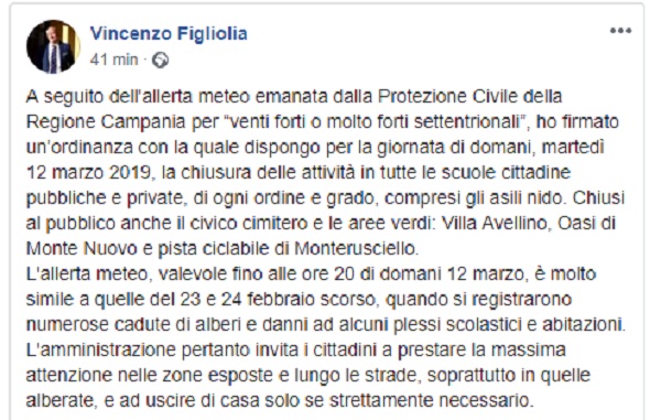 Questo il post pubblicato sulla bacheca fb ufficiale del Sindaco di Pozzuoli Vincenzo Figliolia.