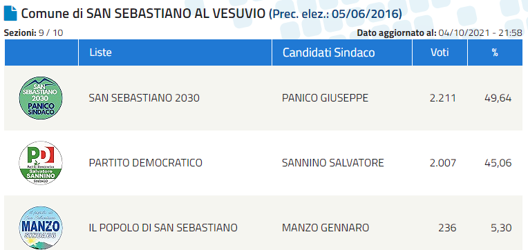 E' Giuseppe Panico il nuovo Sindaco di San Sebastiano al Vesuvio. Di seguito i dati definitivi forniti dal Ministero dell'Interno.