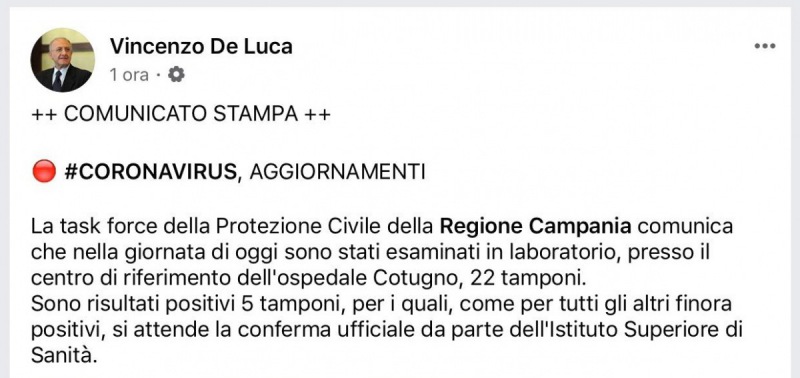 Questo quanto apprendiamo dalla pagina del Governatore De Luca