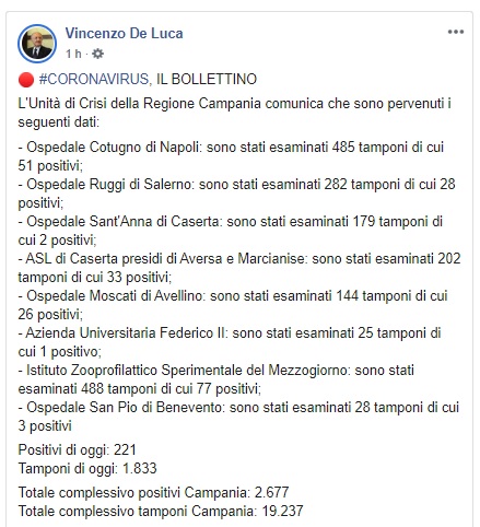 Questo quanto pubblicato dal Pres. De Luca