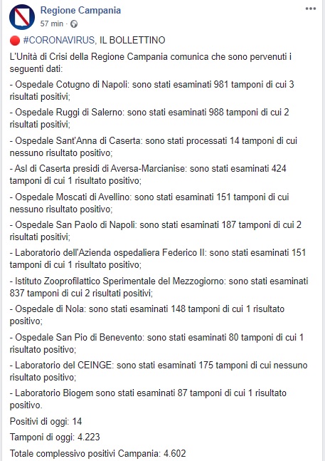 Questo quanto comunicato dalla Regione Campania