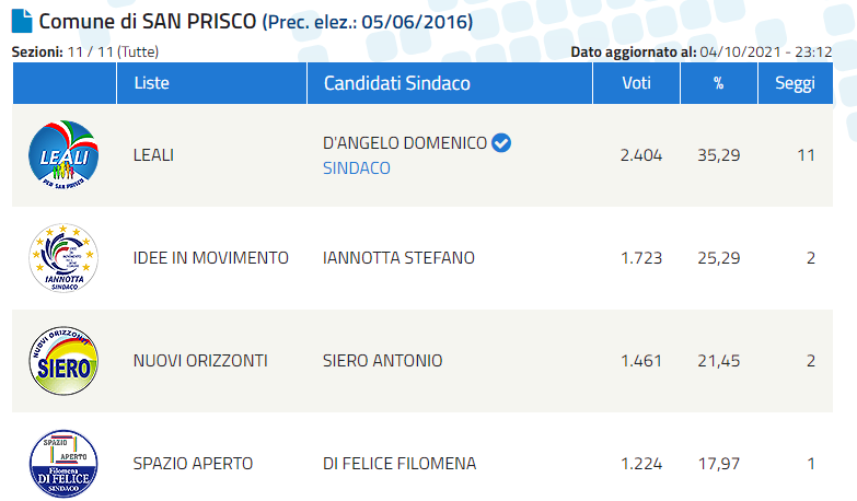 Domenico D'Angelo è stato rieletto Sindaco di San Prisco. Di seguito i dati ufficiali forniti dal Ministero dell'Interno