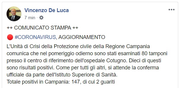 Questo quanto apprendiamo dalla pagina facebook del Governatore De Luca