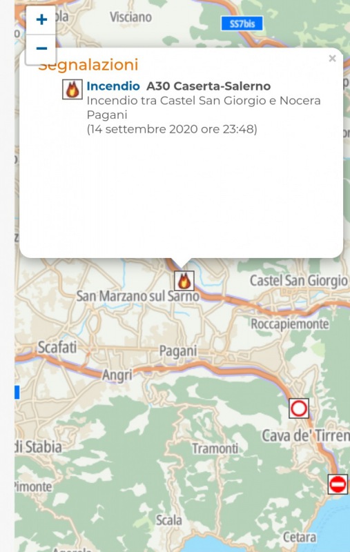 "Incendio A30 Caserta-Salerno. Incendio tra Castel San Giorgio e Nocera Pagani, (14 settembre 2020 ore 23:48)".
