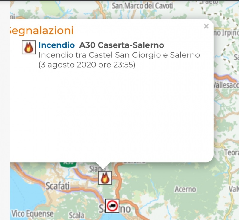 "Incendio A30 Caserta-Salerno. Incendio tra Castel San Giorgio e Salerno (3 agosto 2020 ore 23:55)".