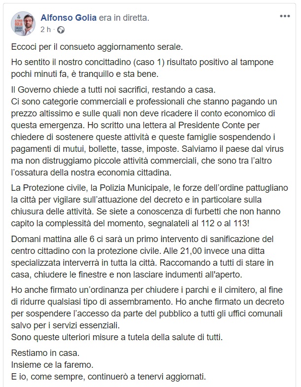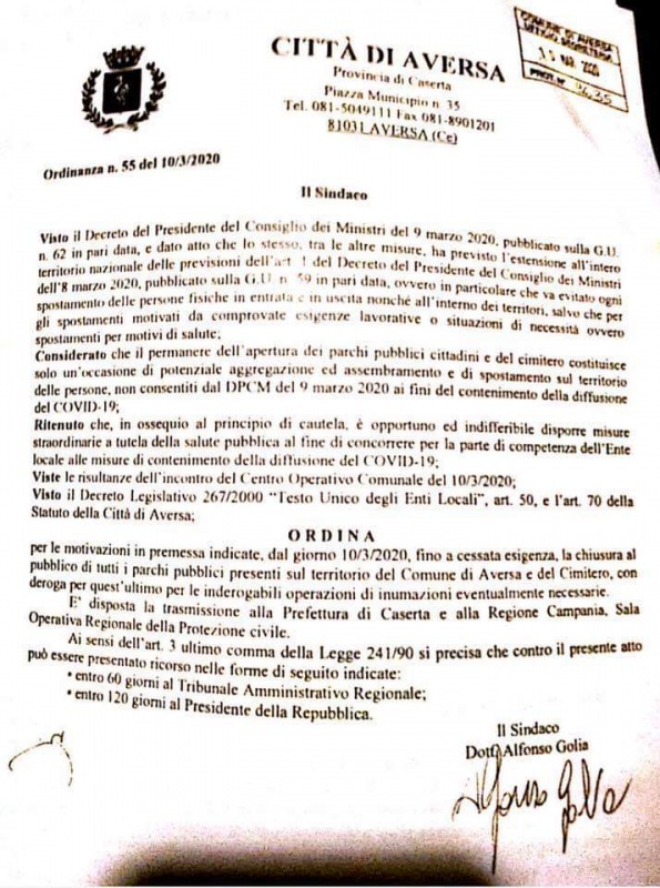 Il Sindaco Golia ha deciso di chiudere tutti i parchi pubblici ed anche il cimitero cittadino. Un ulteriore provvedimento che mira ad evitare il contagio da coronavirus.