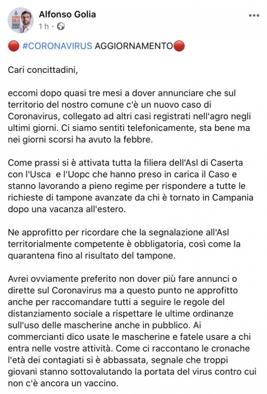 Questo quanto comunicato dal Sindaco Golia