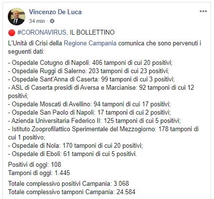 Questo quanto comunicato dal Pres. della Reg. Campania De Luca