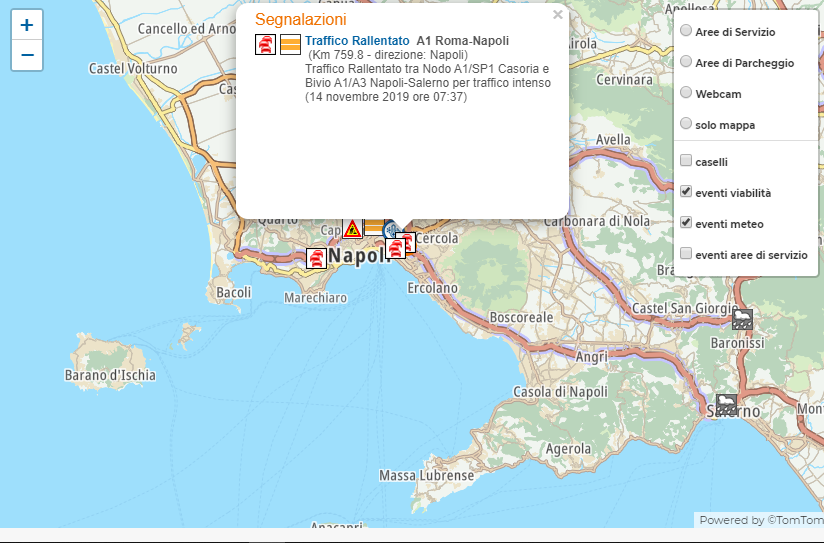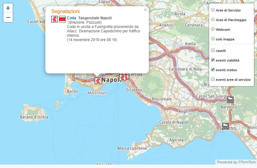 "Coda Tangenziale Napoli (direzione: Pozzuoli). Coda in uscita a Fuorigrotta provenendo da Allacc. Diramazione Capodichino per traffico intenso. (14 novembre 2019 ore 08:16). Traffico Rallentato A1 Roma-Napoli (Km 759.8 - direzione: Napoli). Traffico Rallentato tra Nodo A1/SP1 Casoria e Bivio A1/A3 Napoli-Salerno per traffico intenso. (14 novembre 2019 ore 07:37)".