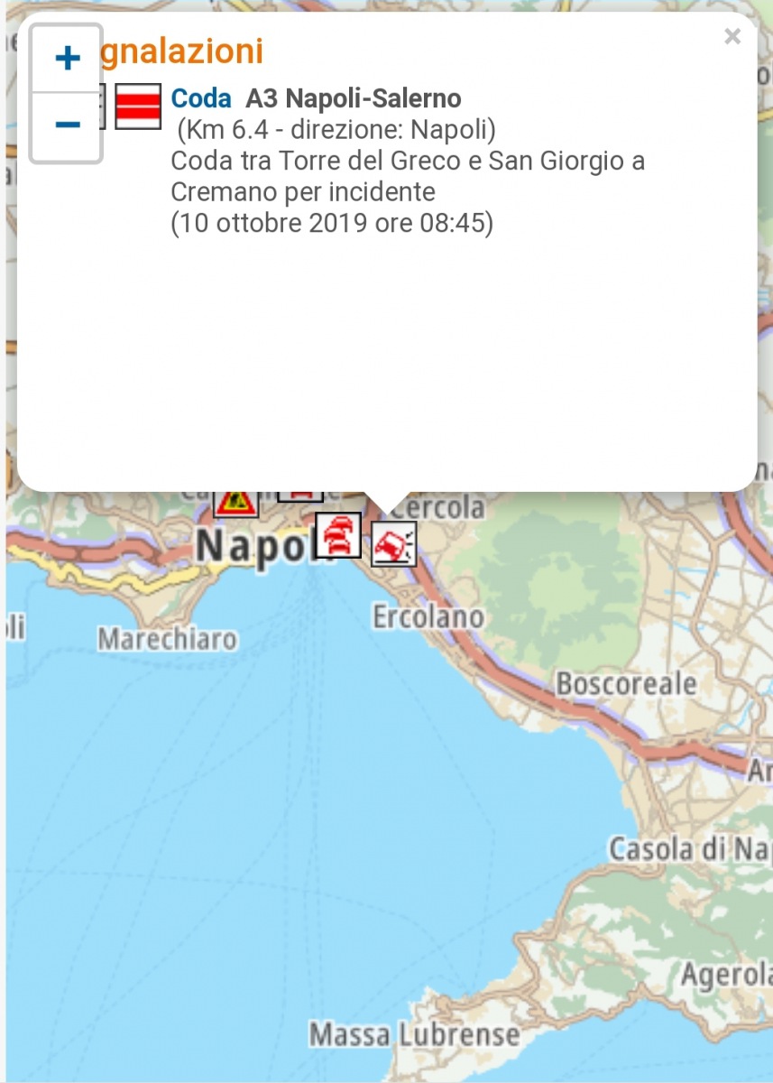 "Coda A3 Napoli-Salerno (Km 6.4 - direzione:Napoli). Coda tra Torre del Greco e San Giorgio a Cremano per incidente. (10 ottobre 2019 ore 08:45)".