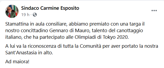 Questo il post pubblicato sulla pagina Facebook del sindaco di Sant'Anastasia, Carmine Esposito: "Stamattina in aula consiliare, abbiamo premiato con una targa il nostro concittadino Gennaro di Mauro, talento del canottaggio italiano, che ha partecipato alle Olimpiadi di Tokyo 2020. A lui - si legge - va la riconoscenza di tutta la Comunità per aver portato la nostra Sant’Anastasia in alto. Ad maiora"!