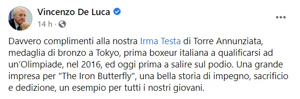 "Davvero complimenti alla nostra Irma Testa di Torre Annunziata, medaglia di bronzo a Tokyo, prima boxeur italiana a qualificarsi ad un’Olimpiade, nel 2016, ed oggi prima a salire sul podio. -Si legge nella nota- Una grande impresa per "The Iron Butterfly", una bella storia di impegno, sacrificio e dedizione, un esempio per tutti i nostri giovani."