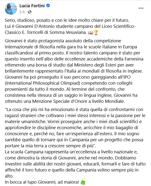 Questo il post pubblicato sulla pagina Facebook di Lucia Fortini, Assessore alla Scuola, alle Politiche sociali e alle Politiche giovanili della Regione Campania. "Serio, studioso, posato e con le idee molto chiare per il futuro. Lui è Giovanni D’Antonio studente campano del Liceo Scientifico-Classico E. Torricelli di Somma Vesuviana. Giovanni - si legge nel post - è stato protagonista assoluto della competizione internazionale di filosofia nella gara tra le scuole italiane in Europa classificandosi al primo posto. Il nostro talento campano è stato per questo inserito nell’albo delle eccellenze accademiche della Farnesina ottenendo una borsa di studio dal Ministero degli Esteri per aver brillantemente rappresentato l’Italia ai mondiali di filosofia in inglese. Giovanni - continua il post - ha poi proseguito il suo percorso gareggiando all’IPO (International Philosophical Olimpiad) competendo con colleghi provenienti da tutto il mondo. Al termine del confronto, che consisteva nella stesura di un saggio in lingua inglese, Giovanni ha ottenuto una Menzione Speciale d’Onore a livello Mondiale. “La cosa che più mi ha emozionato è stata quella di confrontarmi con ragazzi stranieri che coltivano i miei stessi interessi e la passione per le materie umanistiche. Vorrei proseguire - dichiara - anche i miei studi scientifici e approfondire le discipline economiche, arricchire il mio bagaglio di conoscenze e, perché no, fare un’esperienza all’estero. Il mio sogno sarebbe quello di tornare qui in Campania per un progetto che possa portare la mia terra a crescere sempre di più”. La scuola Campana rappresenta un’eccellenza a livello nazionale e, come dimostra la storia di Giovanni, anche nel mondo. Dobbiamo investire sulle abilità dei nostri giovani - conclude il post - educarli, formarli e fare di tutto affinché il loro futuro e quello della Campania volino sempre più in alto. In bocca al lupo Giovanni, ad maiora"!