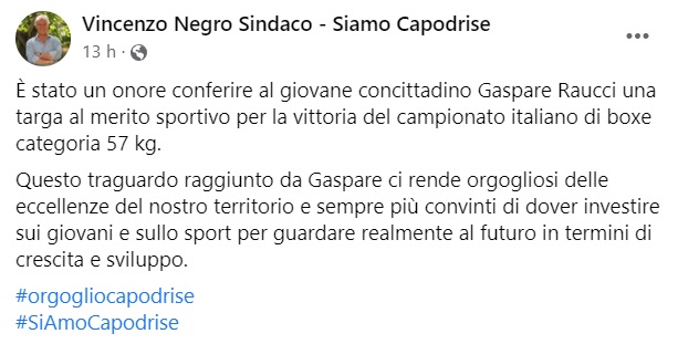 "È stato un onore conferire al giovane concittadino Gaspare Raucci una targa al merito sportivo per la vittoria del campionato italiano di boxe categoria 57 kg. Questo traguardo raggiunto da Gaspare ci rende orgogliosi delle eccellenze del nostro territorio e- si legge nella nota- sempre più convinti di dover investire sui giovani e sullo sport per guardare realmente al futuro in termini di crescita e sviluppo."