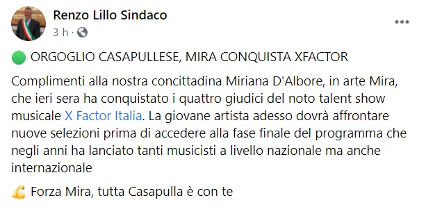 "Complimenti alla nostra concittadina Miriana D'Albore, in arte Mira, che ieri sera ha conquistato i quattro giudici del noto talent show musicale X Factor Italia. -Si legge nella nota- La giovane artista adesso dovrà affrontare nuove selezioni prima di accedere alla fase finale del programma che negli anni ha lanciato tanti musicisti a livello nazionale ma anche internazionale -Si legge nella nota- Forza Mira, tutta Casapulla è con te"