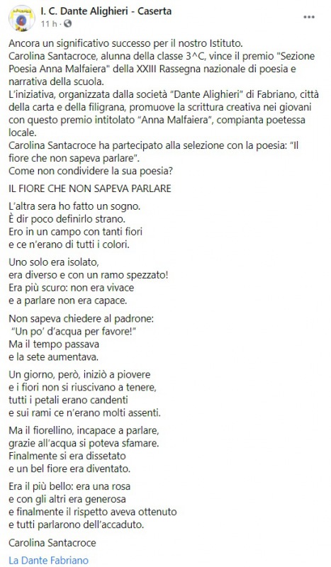 Questo quanto pubblicato sulla pagina facebook dell'I. C. Dante Alighieri - Caserta: