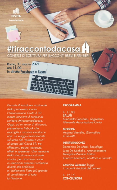 "CONTEST #TIRACCONTODACASA AL TEMPO DEL COVID, IN USCITA L’EBOOK DI MARSILIO EDITORI: TRA I VINCITORI ‘NEL BLU’ DEL CASERTANO NICOLA MAIELLO. Mercoledì 31 marzo, con inizio alle ore 11, si terrà in streaming la presentazione, con diretta su Facebook, dell’ebook "Racconti e immagini. Memoria e testimonianza del vissuto al tempo del Covid-19", pubblicato dalla casa editrice Marsilio. Si tratta- si legge nella nota- di una raccolta di racconti del quotidiano ridimensionato degli ultimi mesi, selezionati a seguito del contest #tiraccontodacasa, organizzato in collaborazione con l’Associazione Civita di Roma in occasione della prima ondata del virus, la scorsa primavera. Nella lista dei vincitori c’è anche l’autore casertano Nicola Maiello con il testo ‘Nel blu’ per la categoria pensieri/riflessioni. Modererà l’incontro il giornalista Rai Andrea Vianello. Parteciperanno alla diretta- si legge nella nota- Simonetta Giordani, segretaria generale dell’associazione Civita, Luca De Michelis, amministratore delegato di Marsilio Editori, e Ginevra Lamberti, scrittrice e giurata. L’attrice Caterina Guzzanti leggerà i racconti premiati."