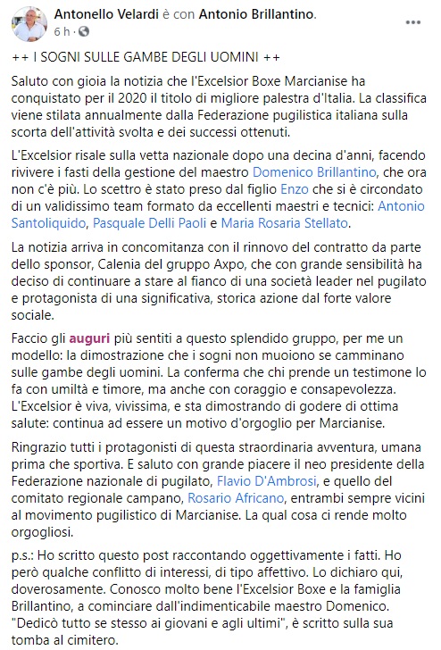 "Saluto con gioia la notizia che l'Excelsior Boxe Marcianise ha conquistato per il 2020 il titolo di migliore palestra d'Italia. La classifica viene stilata annualmente dalla Federazione pugilistica italiana sulla scorta dell'attività svolta e dei successi ottenuti. L'Excelsior risale sulla vetta nazionale dopo una decina d'anni, facendo rivivere i fasti della gestione del maestro Domenico Brillantino, che ora non c'è più. -Si legge nella nota- Lo scettro è stato preso dal figlio Enzo che si è circondato di un validissimo team formato da eccellenti maestri e tecnici: Antonio Santoliquido, Pasquale Delli Paoli e Maria Rosaria Stellato. La notizia arriva in concomitanza con il rinnovo del contratto da parte dello sponsor, Calenia del gruppo Axpo, che con grande sensibilità ha deciso di continuare a stare al fianco di una società leader nel pugilato e protagonista di una significativa, storica azione dal forte valore sociale. -Si legge nella nota- Faccio gli auguri più sentiti a questo splendido gruppo, per me un modello: la dimostrazione che i sogni non muoiono se camminano sulle gambe degli uomini. La conferma che chi prende un testimone lo fa con umiltà e timore, ma anche con coraggio e consapevolezza. L'Excelsior è viva, vivissima, e sta dimostrando di godere di ottima salute: continua ad essere un motivo d'orgoglio per Marcianise. Ringrazio tutti i protagonisti di questa straordinaria avventura, umana prima che sportiva. -Si legge nella nota- E saluto con grande piacere il neo presidente della Federazione nazionale di pugilato, Flavio D'Ambrosi, e quello del comitato regionale campano, Rosario Africano, entrambi sempre vicini al movimento pugilistico di Marcianise. La qual cosa ci rende molto orgogliosi. p.s.: Ho scritto questo post raccontando oggettivamente i fatti. Ho però qualche conflitto di interessi, di tipo affettivo. Lo dichiaro qui, doverosamente. Conosco molto bene l'Excelsior Boxe e la famiglia Brillantino, a cominciare dall'indimenticabile maestro Domenico. "Dedicò tutto se stesso ai giovani e agli ultimi", è scritto sulla sua tomba al cimitero."