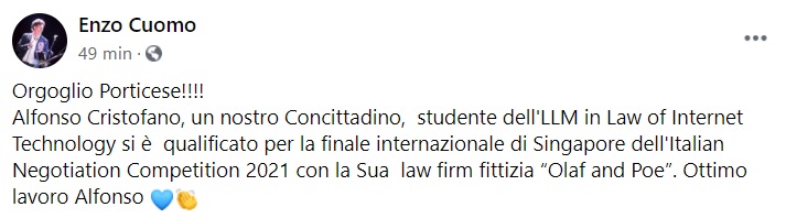 "Orgoglio Porticese!!!! Alfonso Cristofano, un nostro Concittadino, studente dell'LLM in Law of Internet Technology si è qualificato- si legge nella nota- per la finale internazionale di Singapore dell'Italian Negotiation Competition 2021 con la Sua law firm fittizia “Olaf and Poe”. Ottimo lavoro Alfonso"