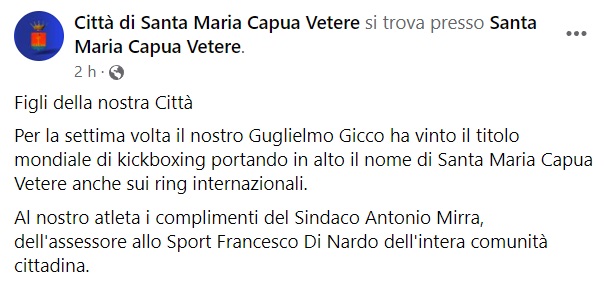 Questo quanto apprendiamo dalla pagina fb del Comune di SMCV: "Figli della nostra Città Per la settima volta il nostro Guglielmo Gicco ha vinto il titolo mondiale di kickboxing portando in alto il nome di Santa Maria Capua Vetere - si legge nella nota - anche sui ring internazionali. Al nostro atleta i complimenti del Sindaco Antonio Mirra, dell'assessore allo Sport Francesco Di Nardo dell'intera comunità cittadina."