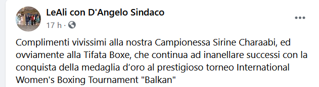 Questo il post pubblicato sulla pagina Facebook del sindaco di San Prisco, Domenico D'Angelo: "Complimenti vivissimi alla nostra Campionessa Sirine Charaabi, ed ovviamente alla Tifata Boxe, che continua ad inanellare successi con la conquista della medaglia d’oro al prestigioso torneo International Women's Boxing Tournament "Balkan - recita il post".