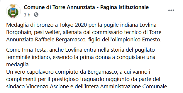 Questo il post pubblicato dalla pagina Facebook del comune di Torre Annunziata: "Medaglia di bronzo a Tokyo 2020 per la pugile indiana Lovlina Borgohain, pesi welter, allenata dal commissario tecnico di Torre Annunziata Raffaele Bergamasco, figlio dell’olimpionico Ernesto. Come Irma Testa, anche Lovlina entra nella storia del pugilato femminile indiano, essendo la prima donna a conquistare una medaglia. Un vero capolavoro - si legge - compiuto da Bergamasco, a cui vanno i complimenti per il prestigioso traguardo raggiunto da parte del sindaco Vincenzo Ascione e dell’intera Amministrazione Comunale".